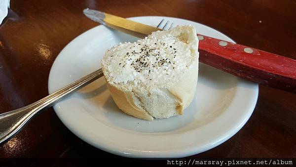附餐麵包的奶油相當好吃,因為它裡面還有起司粒,再撒點胡椒真的可以一連吃好幾片都不會膩![]()